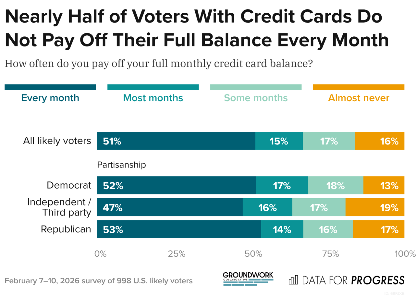 The survey also revealed that credit cards are a critical lifeline for Americans struggling amidst the unprecedented affordability crisis and rising cost of living, finding that nearly half of respondents are not paying their full balance off each month—paying sky-high interest charges to credit card banks as a result. The survey looked at the spending habits of these voters, finding that large shares take on high-rate credit card debt to pay for household necessities like rent and utilities, as well as items hit by President Trump’s tariffs, like groceries. The numbers are even more pronounced among those who do not pay their balance off in full each month, nearly half of whom have used credit cards to pay off other debts.
