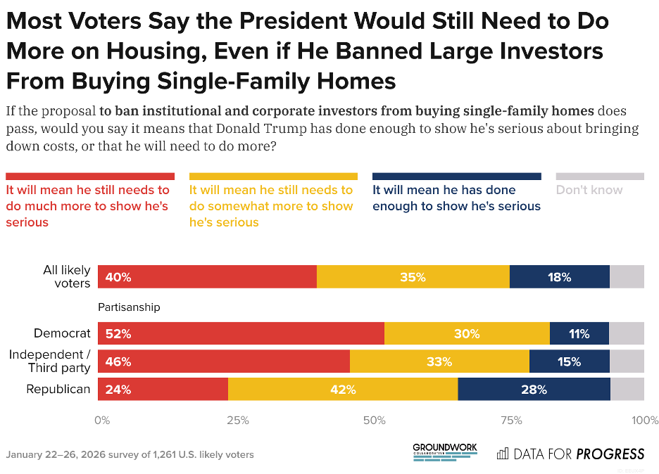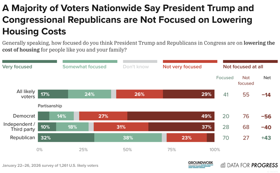 “Americans don’t think the Trump Administration is serious about lowering their housing costs, and new polling from Groundwork Collaborative and Data for Progress shows why. Voters across parties understand that building more housing won’t lower prices if corporate landlords and private developers remain free to jack them up. And despite President Trump’s recent attempted populist pivot, voters don’t believe that he or Republicans in Congress are focused enough on lowering their housing costs to deliver results.”