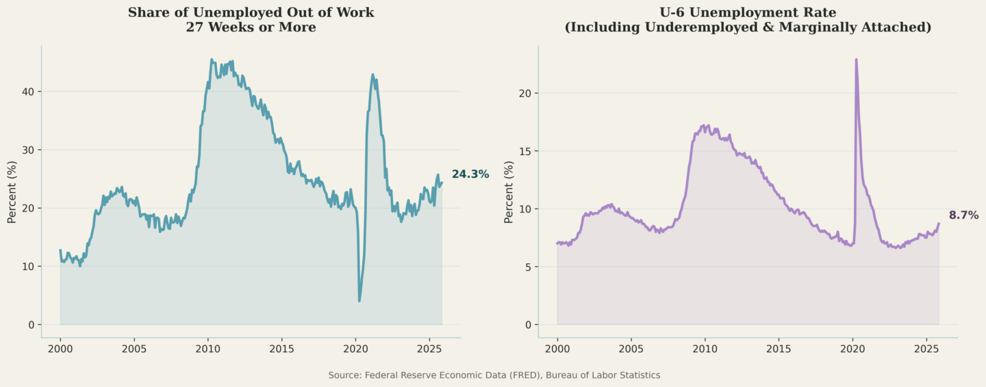 Measures of slack in the labor market are on the rise. Long-term unemployment rose steadily in 2025. At the end of the year, roughly one in four unemployed workers had been without work for more than six months — up 16% from the share at the beginning of the year. The underemployment rate (sometimes called the U-6 rate) includes people actively looking for work but can’t find it (the marginally attached), discouraged workers who want to work but haven’t looked in the past month, and people working part-time but want to work full time. This measure of underemployment shows just how much labor market potential is being left on the sidelines, and how workers on the margins, who often feel the effects of an economic downturn first, are faring. The rate of underemployment increased starkly last year, rising from 7.5% to 8.7% since Trump took office — more than three times the pace of the increase during the same period in 2008 leading up to the Great Recession.