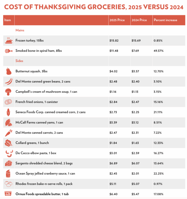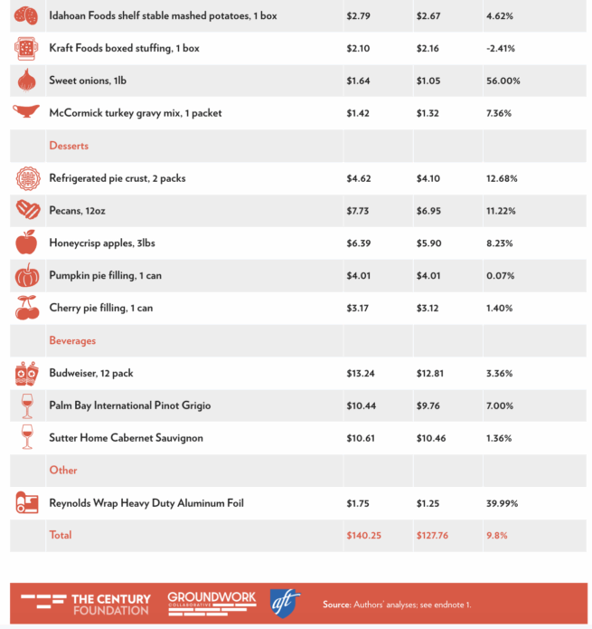 As families across the country prepare to carve turkey and watch football, new analysis from Groundwork Collaborative, The Century Foundation, and AFT finds that the price of a Thanksgiving dinner will be more expensive this year under President Trump, with a full meal up 9.8 percent compared to last year, more than triple the overall rate of inflation. Some staples will run families over 20 percent more than last year’s prices, including onions (56 percent), spiral hams (49 percent), cranberry sauce (22 percent), and creamed corn (21 percent).