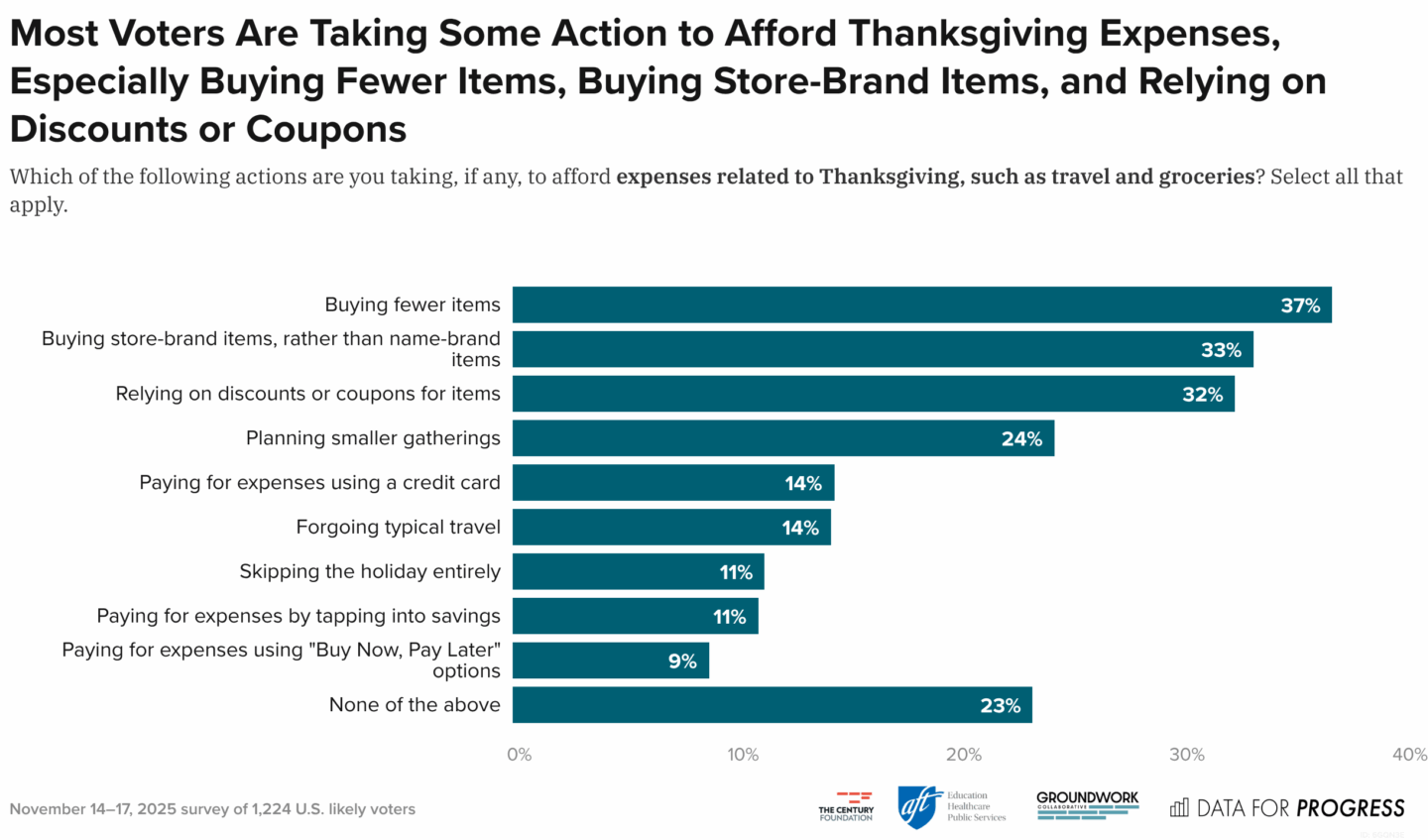 These price hikes come as new Data for Progress polling shows that nearly two-thirds of people are stressed about Thanksgiving prices, with 37 percent saying they plan to buy fewer items and one-quarter saying they are planning smaller gatherings to afford the holiday. Another 14 percent say they will forgo typical travel and more than one in ten say they will skip the holiday entirely.