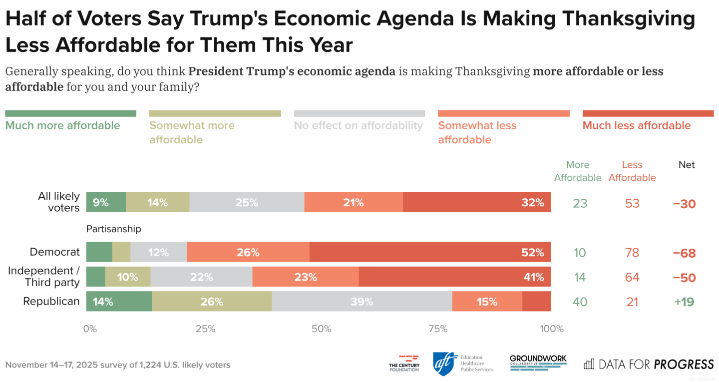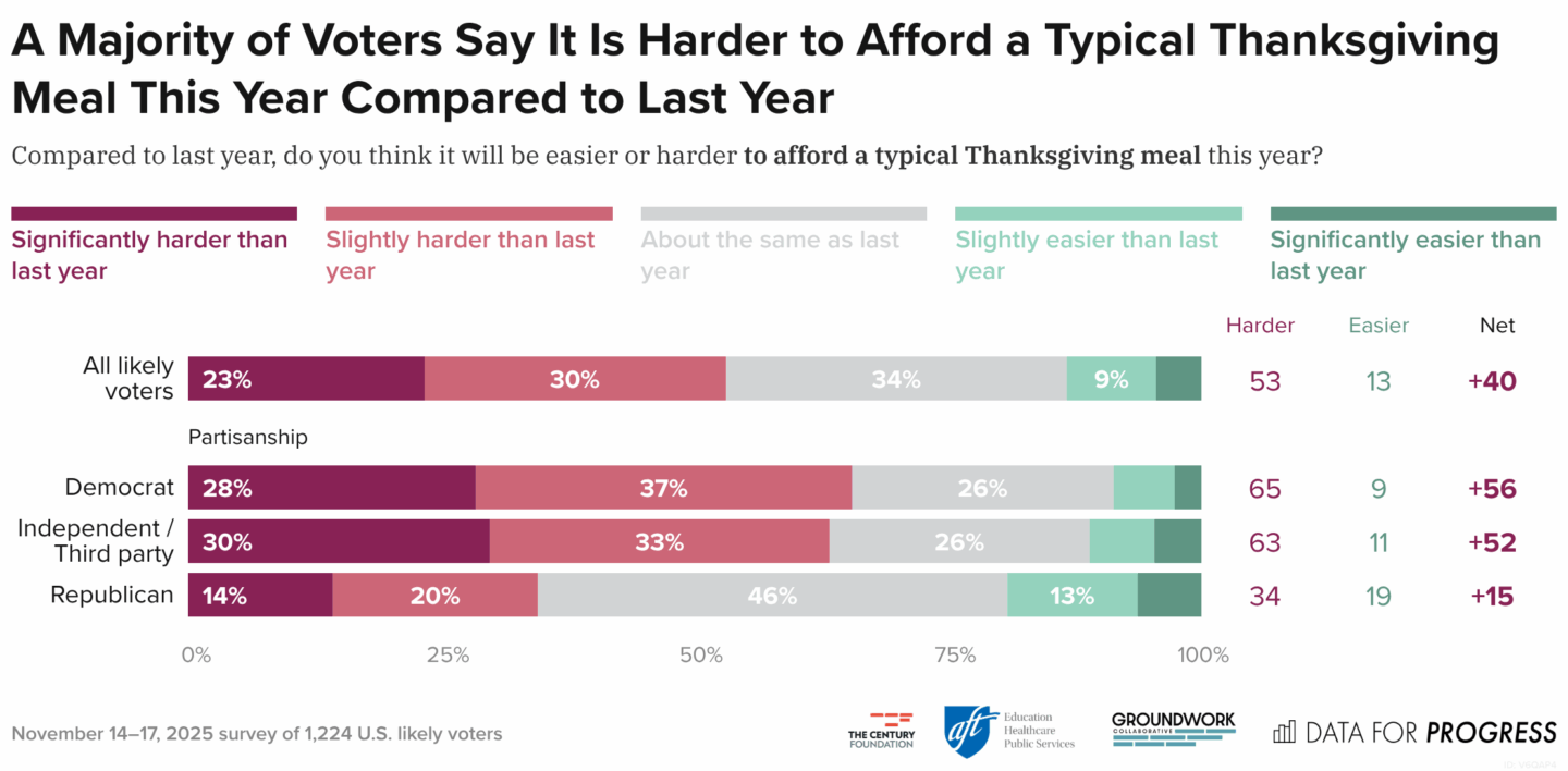 Americans are already feeling the pain of these soaring prices, with a majority saying that it’s harder to afford a typical Thanksgiving meal this year compared to last, according to new polling from Data for Progress. Moreover, two-thirds of voters feel stressed about affording holiday expenses, including one in five who say they feel very stressed.