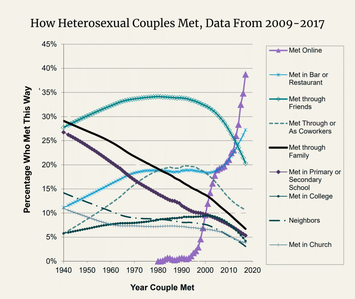 For most of American history, people met their romantic partners “in the wild” — that is, through the free, organic connections primarily provided by family, friends, church, or school. With the exception of professional matchmakers, these “meet-cutes” cost nothing but the time invested in participating in community life and fostering strong social networks.4
