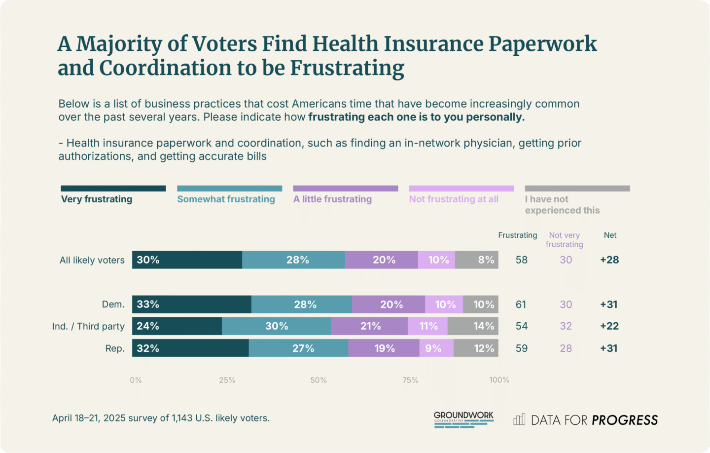 The numbers bear this out. In new polling from Data for Progress, nearly 80% of Americans report at least a little frustration with health insurance paperwork and coordination.17 All told, American workers collectively spend about $21.6-billion-worth of time each year dealing with health care administration, between calls, claims, explanations, and paperwork, according to a recent analysis.18 Polling confirms this: More than one in three Americans report dealing with health insurance headaches more than 20 times per year.