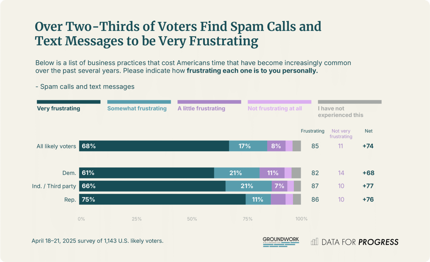 This deluge of digital junk annoys just about everybody. Data for Progress found that virtually all respondents said spam calls and texts were at least “a little frustrating,” and 68% found them “very frustrating”.30 Nearly half said they’d be willing to pay money just to make them stop.